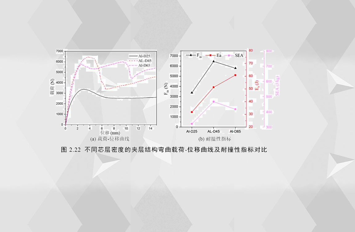 對不同芯層密度的鋁合金夾層結(jié)構(gòu)而言,其載荷-位移曲線和壓潰過程差別較大,如圖2.22(a)所示,芯層密度為0.25g/cm3的AL-D25和芯層密度為0.45g/cm3的AL-D45的載荷-位移曲線屬于類型I,芯層密度為0.65g/cm3的AL-D65的屬于類型Ⅱ,AL-D25的臨界失效模式為芯層剪切(CS),臨界載荷最小,由于其芯層密度較低,其后期主要失效形式還是以剪切裂紋為主,后屈曲壓潰力與臨界失效載荷相比相差不大。AL-D45的臨界失效模式也為芯層剪切(CS),其臨界載荷是三者中最大的,在臨界失效之后小段位移耦合了下界面失效,其載荷下降很快,嚴(yán)重降低了試件吸能。值得注意的是,雖然AL-D65的芯層密度比AL-D45的大,芯層可以承受的剪切強(qiáng)度大,但AL-D65的芯層的平均胞元大小比AL-D45的小,界面的強(qiáng)度比AL-D45的小,而在加載過程AL-D65的界面能承受的剪切強(qiáng)度比芯層能承受的剪切強(qiáng)度小,所以發(fā)生了界面分離的臨界失效模式,使得AL-D65的臨界載荷反而比后者的小。雖然AL-D65在彎曲位移2.5mm左右處發(fā)生界面失效,但其失效界面的位置為上膠層,位移相對較小,試件整體的承載能力還很強(qiáng),所以其載荷下降的幅度比例相對AL-H10更小,所以前者的吸能效果更佳。