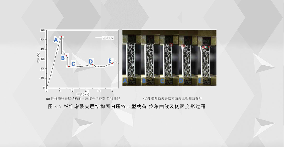 對于面板為纖維增強復合材料(碳纖維和玻璃纖維)的夾層結構而言,其載荷-位移曲線和變形/失效與鋁合金夾層結構的有很大的差異。以面板厚度約1.5mm 的碳纖維夾層結構為例,其載荷-位移曲線大致可以分成兩個階段,如圖3.5(a)所示,第一階段為彈性階段O-A,與鋁合金夾層結構的曲線第一階段相似,載荷隨位移的增加而基本呈線性增長;第二階段為A點之后,隨著壓潰位移的增加,碳纖維面板發生脆性斷裂,導致載荷發生斷崖式下降,由于加載位移較小,芯層泡沫未發生嚴重的破壞,使得纖維增強夾層結構仍具有一定的承載能力。